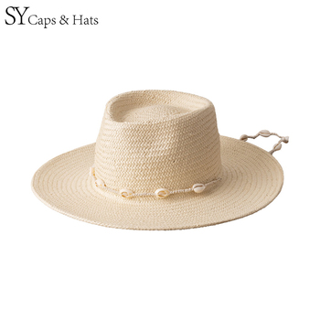 SY HATS 100% Papel Palha Aba Larga Chapéu Fedora Com Conchas Cadeia Guarnição Mulheres Verão Chapéu De Palha Personalizado OEM Disponível